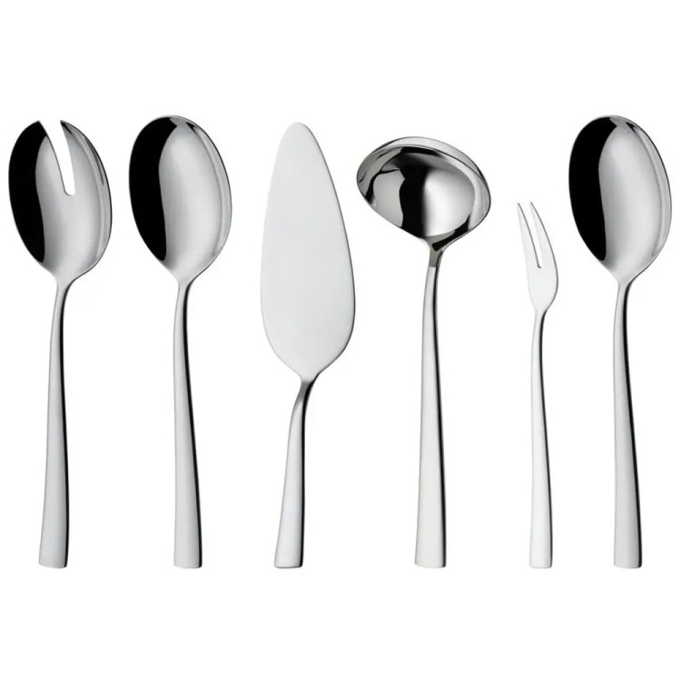 89 عدد برای 12 نفر: 12 عدد چنگال شام، چنگال شام، قاشق غذاخوری، قاشق چایخوری، قاشق دسر، چنگال دسر، چاقوی دسر، 2 عدد سرو سالاد، 1 عدد قاشق غذاخوری، 1 عدد ملاقه سوپ، 1 عدد چنگال، 1 عدد سرویس کیک